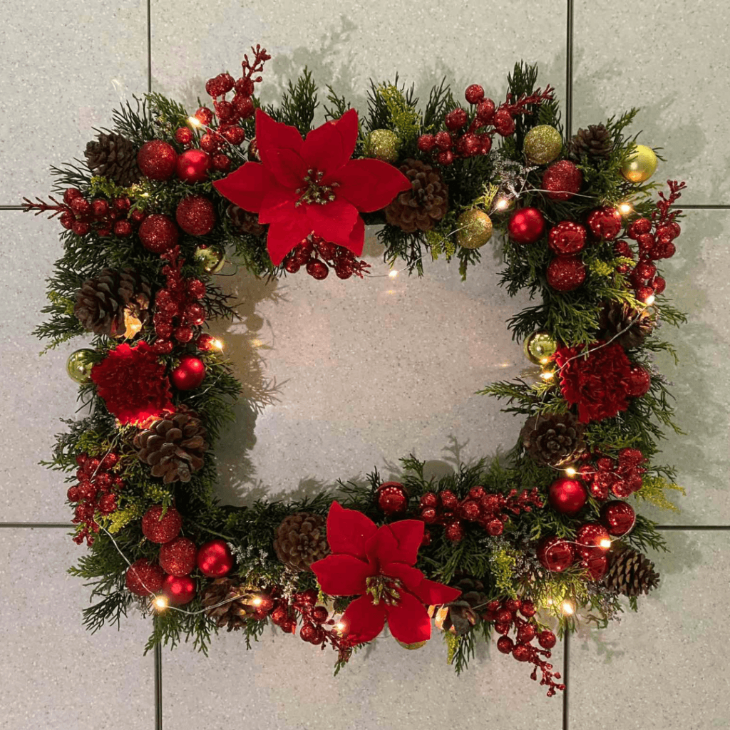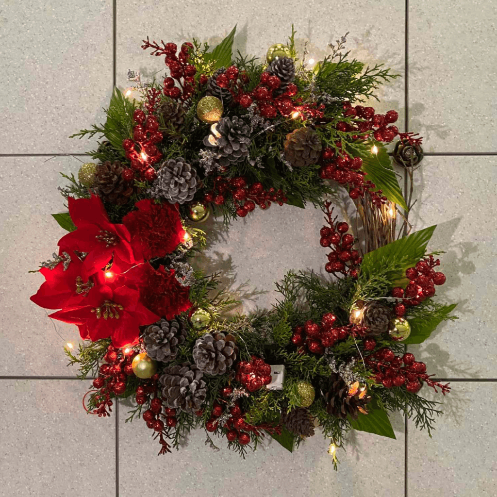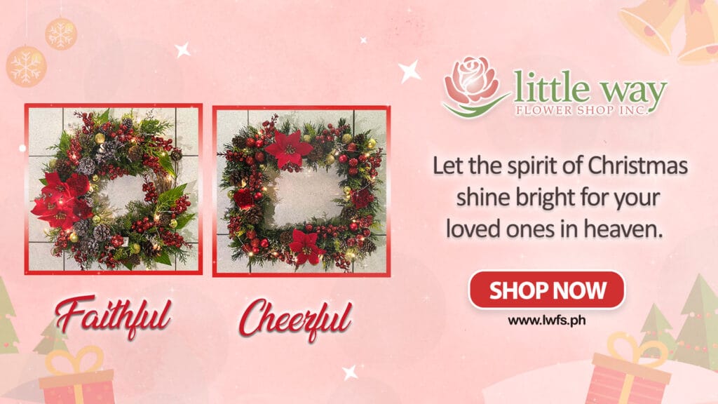 Celebrate the spirit of Christmas with the Faithful Christmas Special Vault Flower. This beautiful arrangement features fresh carnations, misty blue, cypress baguio, pinecones, and anahaw, along with artificial poinsettias, berries, red and gold Christmas balls, and twinkling fairy lights. A heartfelt tribute to your departed loved ones this holiday season.